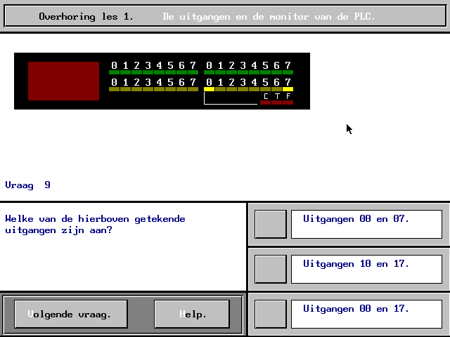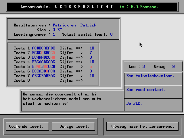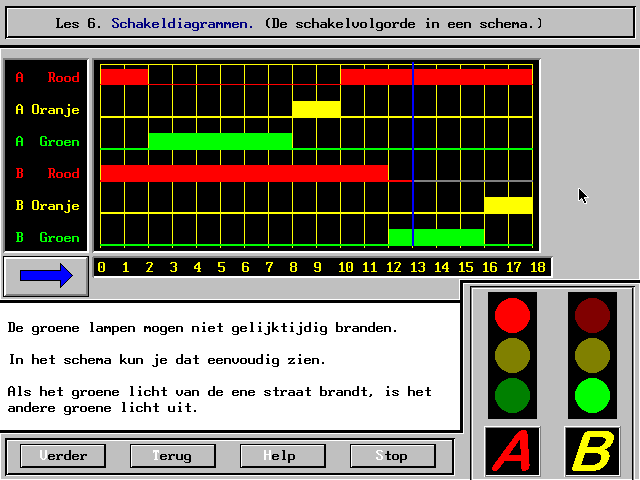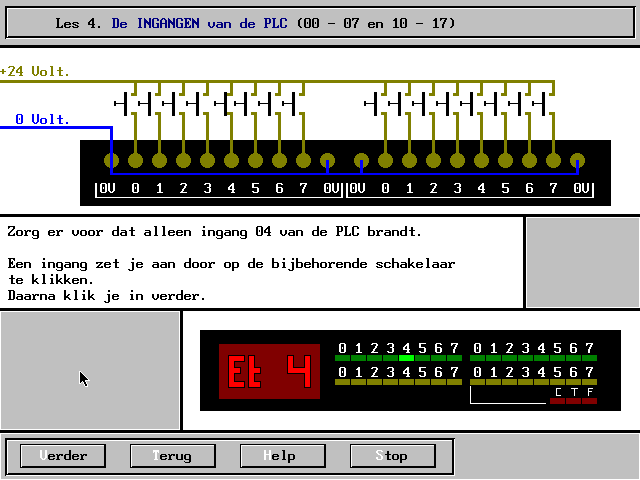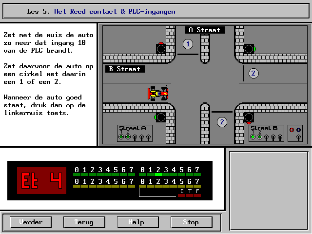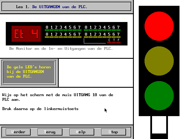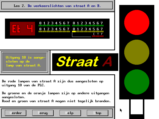 Hieronder zijn een aantal schermafdrukken van het programma voor de verkeerslichten afgebeeld. U kunt zo een goede indruk van het programma krijgen. De aanduiding Et 4 in de monitor van de Plc staat er alleen wanneer de Plc aangesloten is op de computer. De 4 in deze aanduiding geeft de baudrate aan. (4800 Bd)